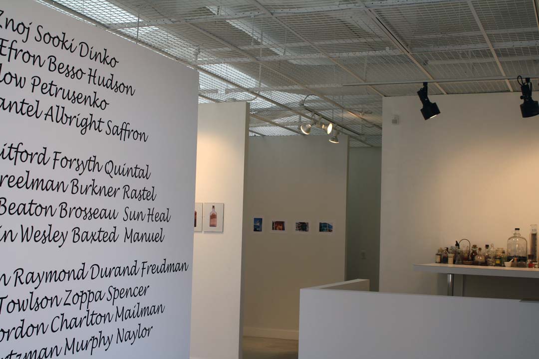 Jane Grace installation (table piece), Patricia Dawkins installation (lightboxes in alcove) and Leslie Sweder paintings