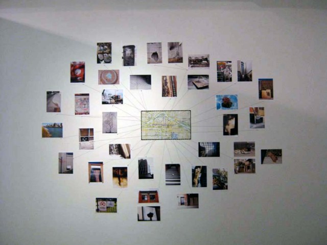 16×20″ color photographs, 8×10″ black and white photographs, several 4×6″ color photographs attached to a map of downtown Calgary with string, Polaroid piece (70 Polaroids of Zürich)