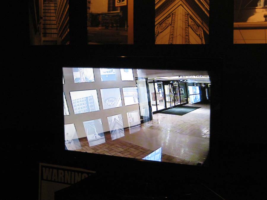 installation consisting of 15 8×10″ images, surveillance monitor, camera, and sign