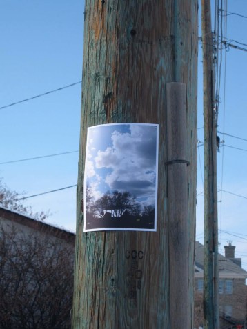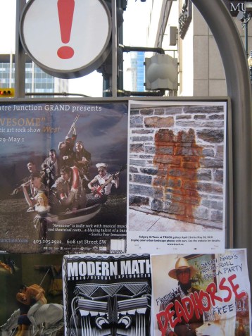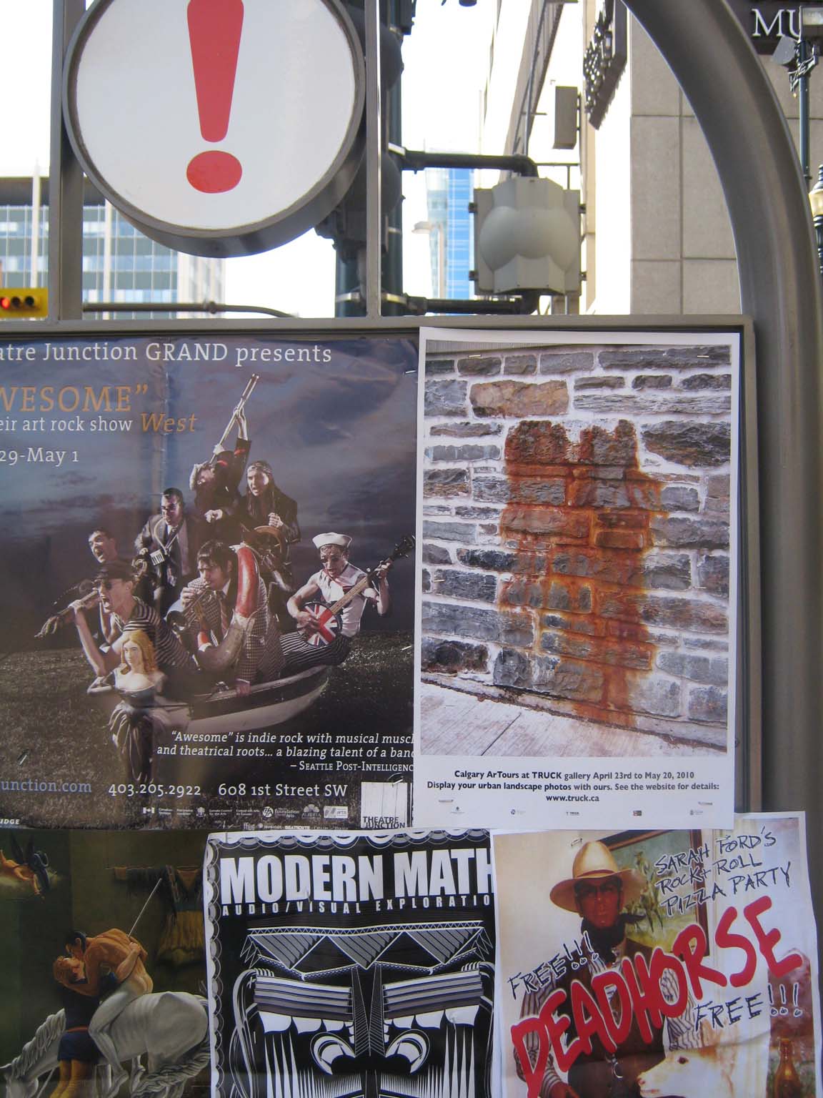 Public intervention to me means bringing art out of the gallery and onto the street by postering, leaving photos around, and going on photo walking tours with the public (see Calgary photo walks). The actions are meant to surprise the public and challenge the viewer/finder to respond. The photos I have left in the downtown core have had messages on the back directing the finder to a website or participate in an action. I started postering in 2009: